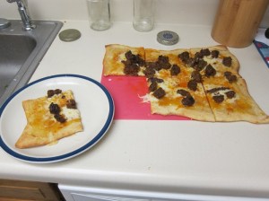 Remove the crust from the oven and spoon several large spoonfuls of apricot preserves on it. As the heat of the crust begins to melt the preserves, spread them to thinly cover the whole crust except for a thin edge all the way around for later handling. Cover the apricot preserves with the grated cheese, then top with as much of the cooked chorizo as desired/as fits. Bake an additional 8-10 minutes. Slice, and enjoy!