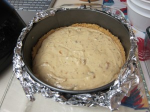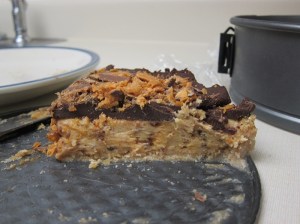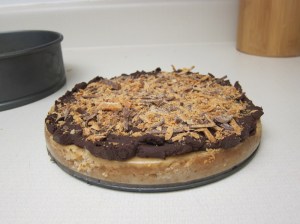 As should come as no surprise to anyone, Butterfinger Cheesecake is quite delicious! I had adapted a recipe for mini-cheesecakes into one cheesecake, which worked fine except I’m going to recommend that for you all, instead of making a chocolate layer on top, which gets rock hard in the refrigerator and smooshes your cake when you press down to cut it, you just drizzle each slice with hot fudge sauce when serving. Smoosh-problems solved!