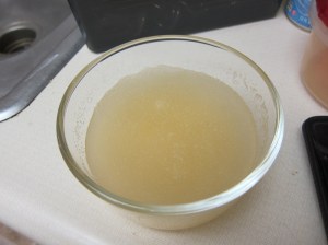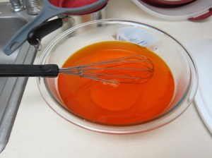 After 2 hours, in a medium bowl combine the orange jello and the boiling water. Stir until dissolved, about 3 minutes. Add the cold water, and let sit until cooled to room temperature. You can do this on the counter or in the fridge, but check frequently if you’re refrigerating.