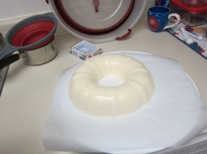 Beat in the melted gelatin. Pour the mixture into the bundt and refrigerate at least 2 hours, until set.