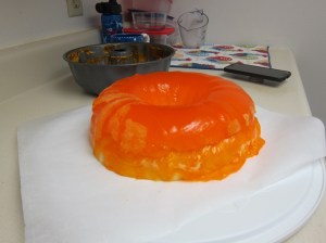 Once the orange jello is room temperature, remove your bundt pan from the fridge. Invert the cream cheese jello mixture to turn out onto a platter, then flip it right back in the pan.