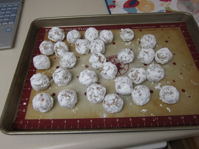 Place the powdered sugar in a small, shallow dish. Roll the dough into small (~1 tablespoon) balls, then roll in the powdered sugar to cover.