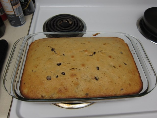 A big, moist banana cake with a bit of chocolate for dessert-y-ness. I considered putting chocolate frosting on top, but don’t think it needs it.