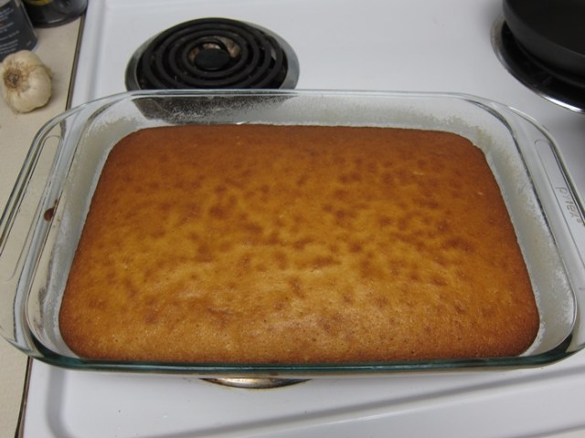 Once the cake has cooled for 15 minutes, use a for to poke rows, 1″ apart, the length and width of the cake. Pour the glaze over the cake, slowly that it can be absorbed into the holes rather than all run off the sides. Refrigerate several hours or overnight to set.