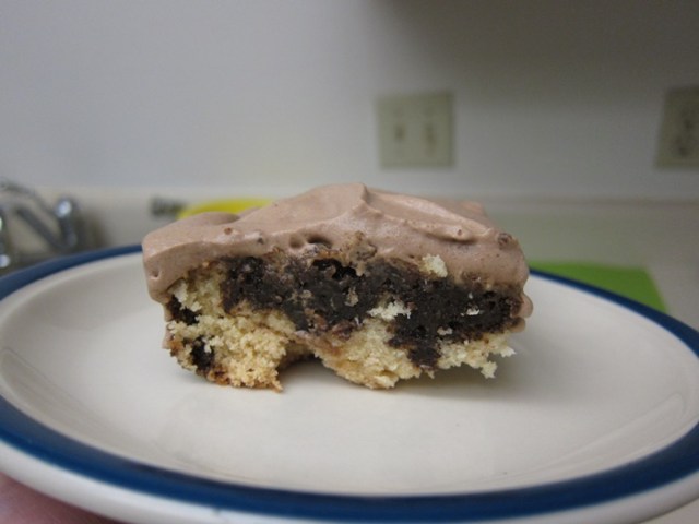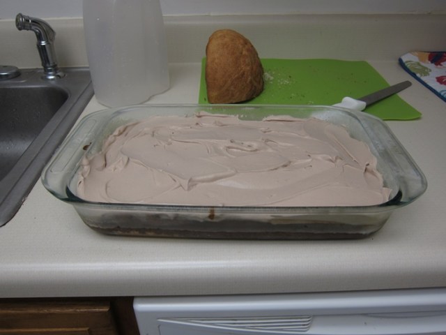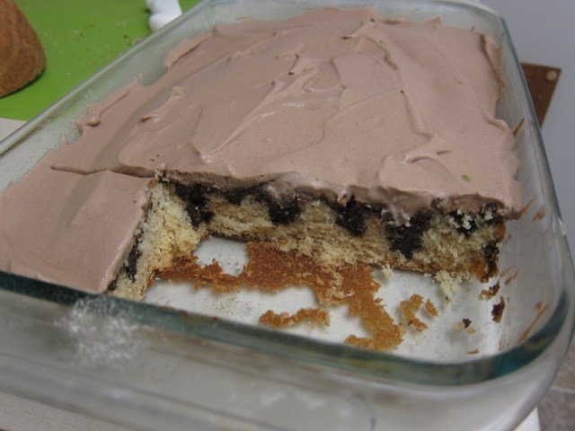 I bought ingredients for last week’s layered chocolate dessert knowing I’d need to use up some cream and the chocolate syrup, so it was a 2-dessert plan, along with this cake. It was, I’m going to say, a very good plan! This is basically a nice vanilla 1 bowl cake, which then gets doused in chocolate and covered in a light chocolate whipped cream. What could be better?