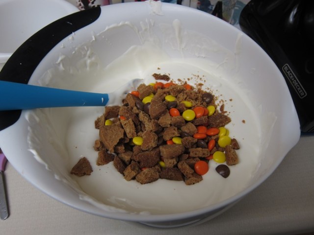Use a spatula to stir in the crushed cookies and Reese’s Pieces by hand.