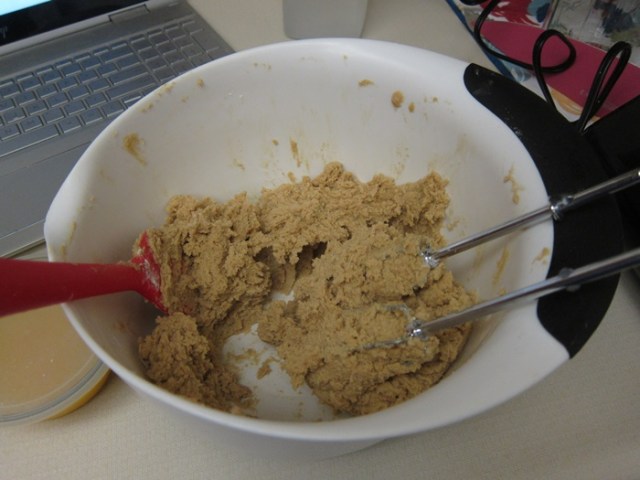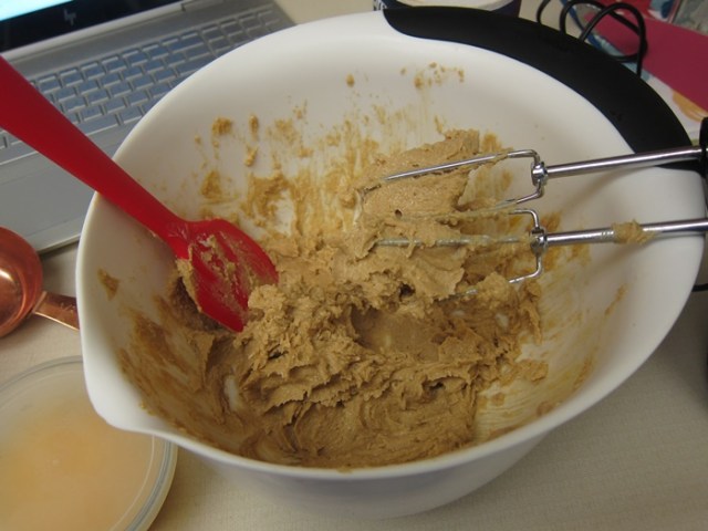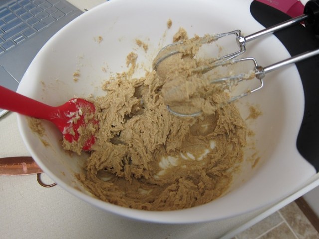 To make the cookies, first cream together the butter and sugars in a large bowl.