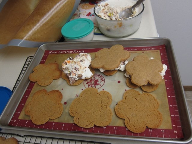 Roll the cookies out on a lightly floured surface to somewhere between 1/2 and 1/4 in thick. Cut out cookies with a sharp cookie cutter and place the cutouts on the prepared sheets. Bake for 10-12 minutes, until golden and crispy. Remove to a wire rack to cool, then pair up and fill with ice cream to make ice cream sandwiches!