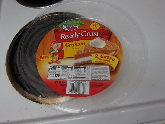 - 1 ‘extra 2 servings’ size pre-made graham cracker crust (you could probably make your own in a 10″ pan, I haven’t actually measured how big this is!)