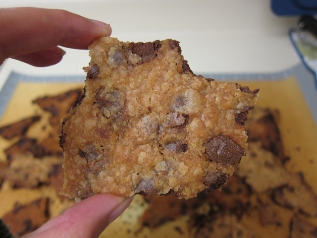 Whisk in the vanilla and salt, followed by the flour, stirring until evenly mixed. Stir in the chocolate chips, then turn out onto the lined pan. Spread the dough thinly, pressing all the way out to the edges of the pan, then bake for 25 minutes, rotating halfway through.
