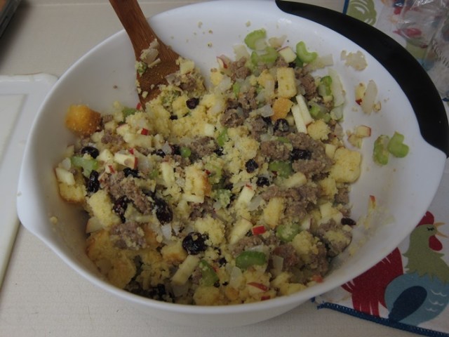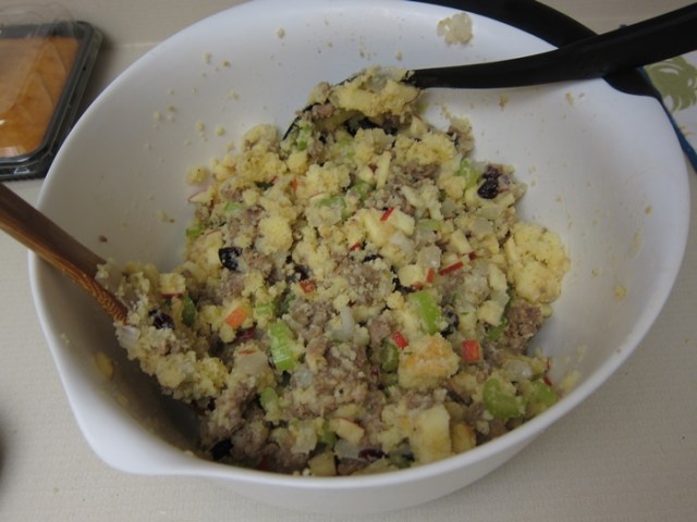 Transfer the sausage mixture to a large bowl and add the salt, pepper, cornbread, apple, craisins, parsley, and sage. Stir together well.