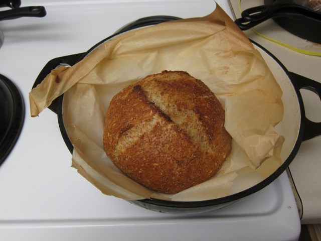 Remove the dutch oven from your oven. Use the parchment paper to transfer the dough into the dutch oven, and put the lid back on. Return to the oven for 30 minutes. Remove the dutch oven’s lid and bake another 20-25 minutes until crusty, brown, and hollow sounding when tapped on the bottom.
