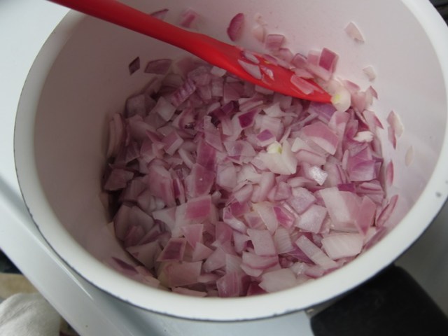 Meanwhile, place the red onion in a saucepan and cook over medium heat until translucent and softened.