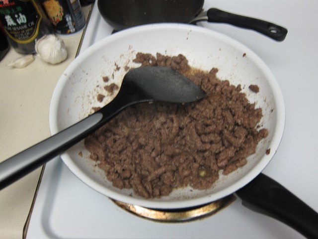 Once browned, remove from the pan. Heat the other tablespoon of oil and brown the meat until cooked through.