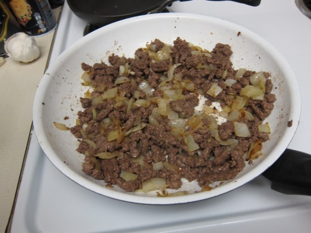 While the chutney cooks, prepare the meat mixture. In a large skillet, heat one tablespoon of oil over medium heat and add the diced onion. Cook until browned, which takes a while. Just go with it.