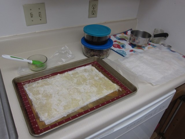 When ready to assemble, heat your oven to 375 degrees and line a baking pan with parchment/a silpat. Get out your thawed phyllo dough, but cover them with a damp cloth/paper towel to prevent them from drying out as you work. Lay out a single sheet of phyllo and brush the whole top with melted butter. Repeat with 5 more sheets layered on top, each brushed with butter, until you have a 6-sheet stack.
