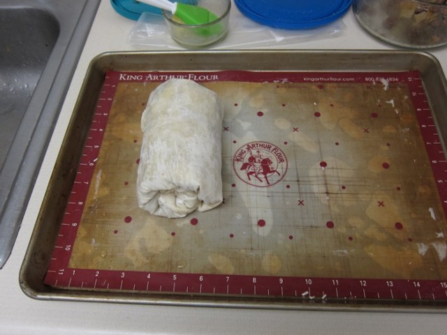 Place on your lined pan, seam-side-down, and brush the outside with additional butter. Repeat with the remaining ingredients to form a second strudel.