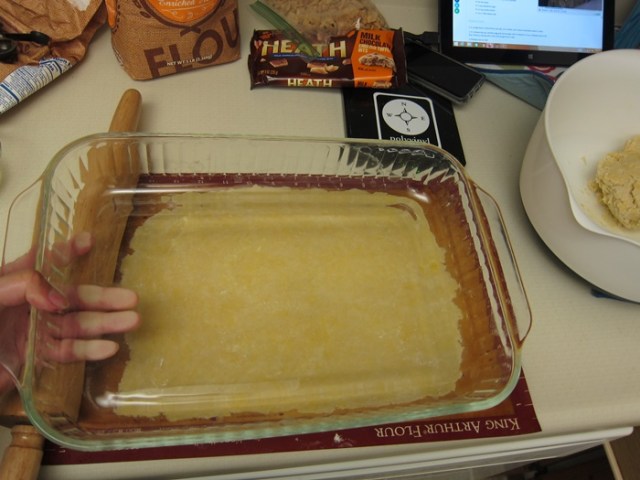 Roll one of the portions of dough out to ~9×13, big enough to fit either your 9×13″ pan or the sliiiightly larger quarter sheet pan, and lay the dough in the bottom of an ungreased pan.