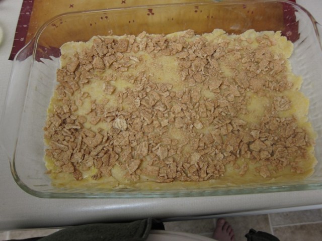 Roll one of the portions of dough out to ~9×13, and lay the dough in the bottom of an ungreased pan. Sprinkle the Cinnamon Toast Crunch over the spread dough.
