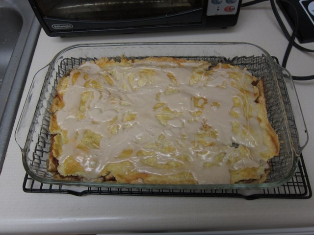 When the slice is baked, whisk together the powdered sugar, vanilla, and enough milk to make the glaze a drizzling consistency, then drizzle over the still-warm pastry. Cool completely before slicing.