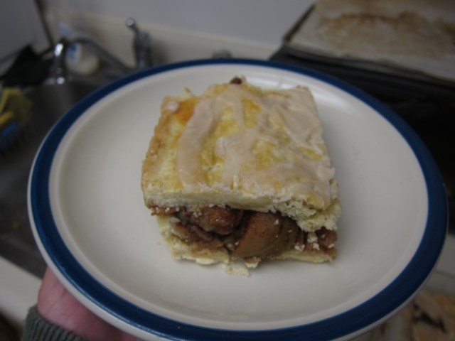 When the slice is baked, whisk together the powdered sugar, vanilla, and enough milk to make the glaze a drizzling consistency, then drizzle over the still-warm pastry.