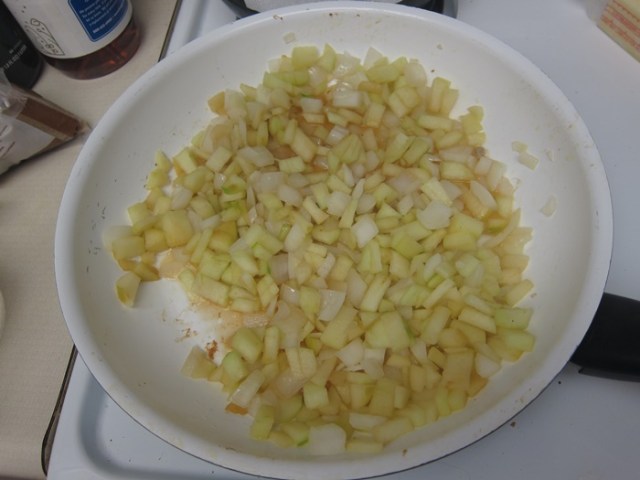Chop the apples and onion finely. Cook, with the shortening, in a large skillet over medium heat for 10 minutes.