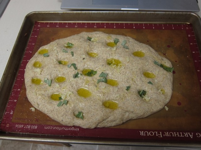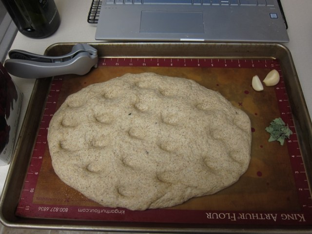 A reasonably quick bread that is really tasty from a topping of salt, herbs, and olive oil. I made this with sage, because that was what was in some of the other dishes in the meal I was making, but rosemary or oregano would also be good.