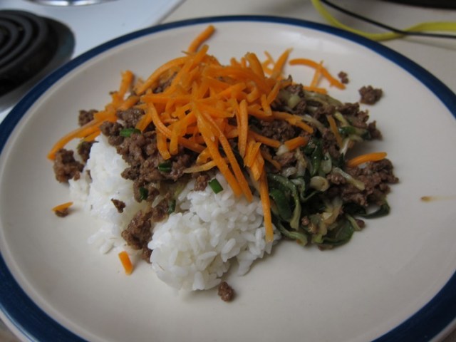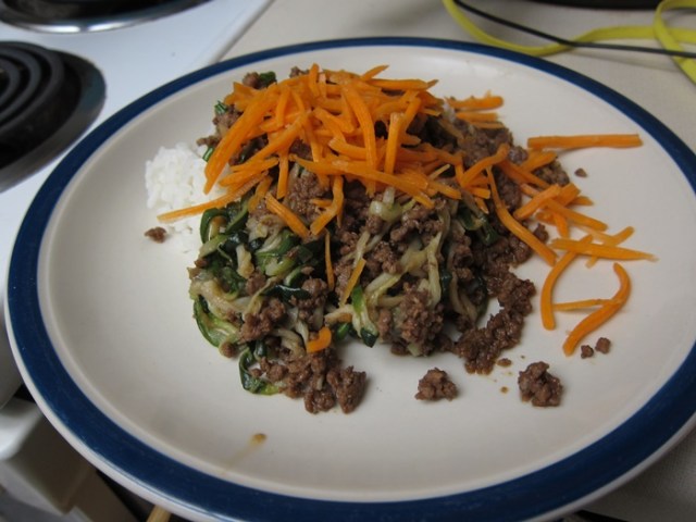 Tasty marinated ground beef with some veggies for healthiness sake, and rice because what’s a meal without carbs? You can use a wide variety of vegetables to suit your preference, but thinly cut/shredded/spiralized ones are the way to go both for quick cooking and for the texture of the finished dish. The original recipe called for spiralizing your own zucchini, but since my spiralizer is a 12 hour drive away I just bought some frozen zoodles and only cooked them partway before adding to the dish. Do what makes sense for you! I also ignored the suggestion for jasmine rice, as I already have/prefer sushi rice!