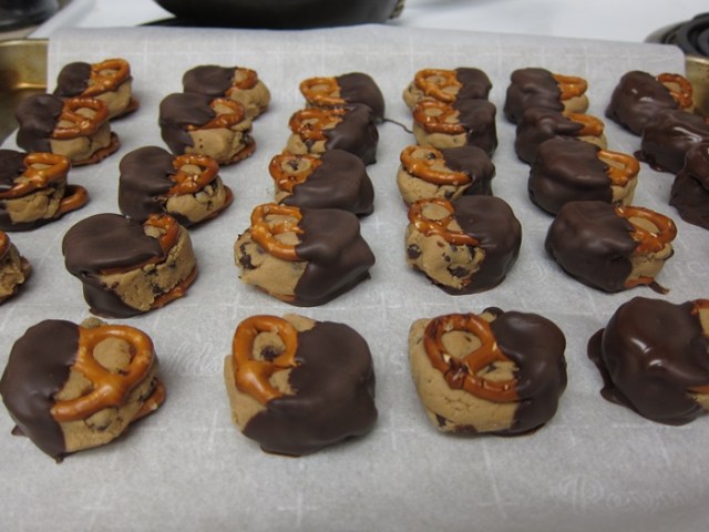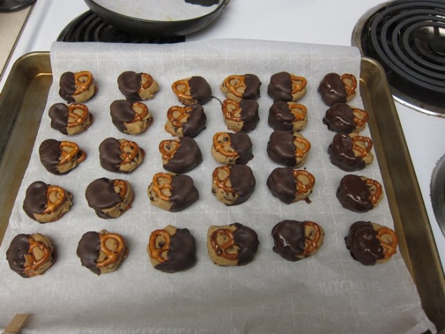 Get your pretzels and your cookie dough ready back by your pan. Scoop out two-teaspoon portions of cookie dough – an actual dough scoop would be useful and provide more even portions, but my scoop is definitely bigger than that. Sandwich each ball of dough between two pretzels and squeeze until they hold together, then place on the pan. Once all the dough has been sandwiched, freeze all the sandwiches for at least 15 minutes.