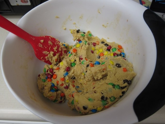 Beat in the flour until just combined, then stir in the 1 1/2 cups M&Ms by hand.