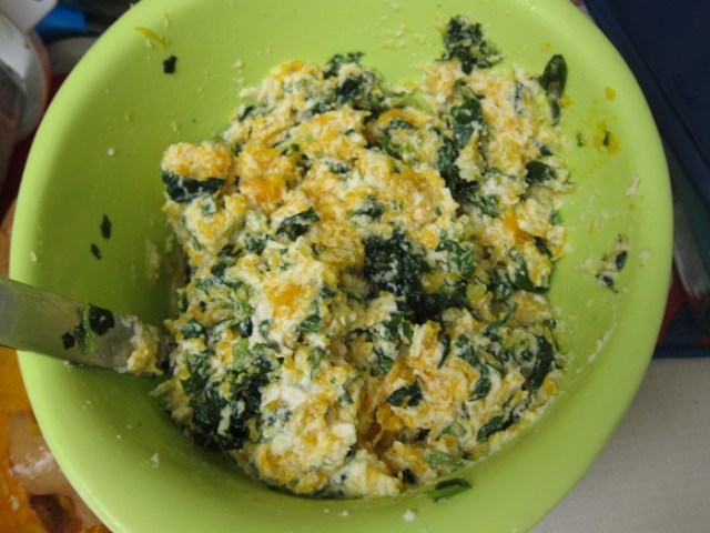 - 4 ounces frozen chopped spinach (thawed and drained) (I used twice as much this time, because my package was all frozen in one lump – this was neaaarly too much/too spinach-y)