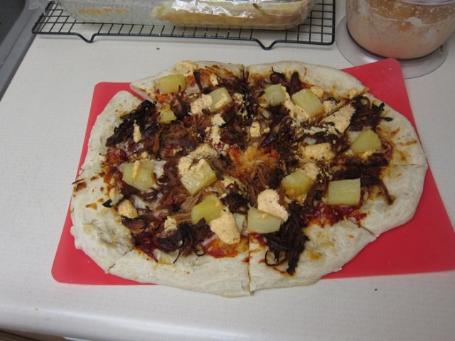 To make the pork, the night before you want pizza put the pork shoulder/butt in a crockpot. Combine the gochujang, soy sauce, honey, and chicken stock in a medium bowl and pour over the pork. Cover and cook on low 8-10 hours. Transfer the cooked pork to a large bowl and pour the liquid from the crockpot into a large pot, straining out any big lumps of fat that fell off in the liquid. Heat on high and boil until reduced to about 2 cups, 15ish minutes.