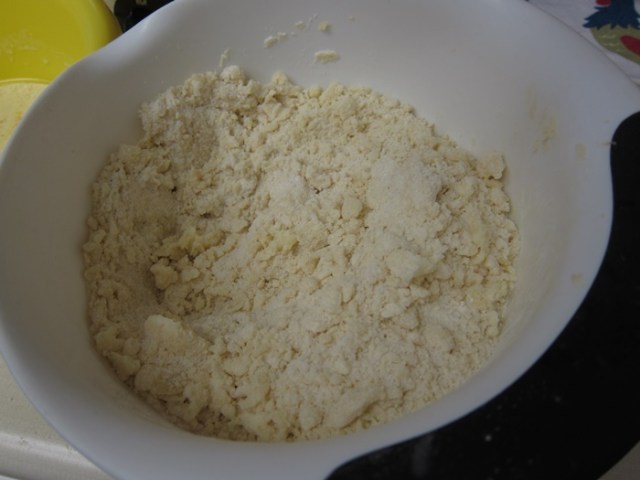 Cut the room temperature butter into chunks and add to the dry goods mixture. beat together until the mixture becomes crumbly and resembles sand.