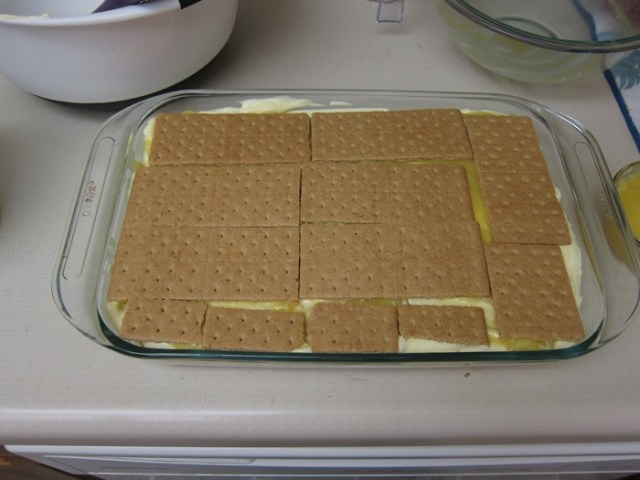 Spread half the pudding mixture over the graham crackers, followed by half of the lemon curd.