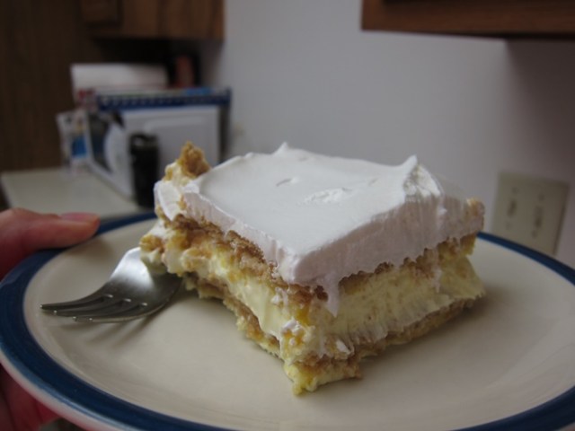 Same general concept as an eclair cake, this is an easy dessert to throw together the day before, and then feed a crowd with something sweet and tart and delicious! Ideally you’re eating it with a bunch of friends and won’t have many leftovers, but if you do, even by day 10 or 12 so (I live alone!) it still tastes just as good, there’s just a tiny bit of liquid separating out by then.