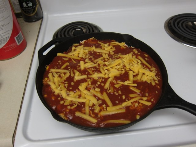 When the sauce and cornbread are ready, poke holes all over the cornbread and drizzle 1/2 cup of the enchilada sauce on/into the cornbread.