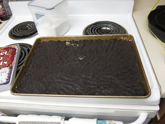 Press the mixture evenly into the bottom of the pan and bake 10 minutes. I found that it was only just barely enough to cover the pan, with a few tiny gaps, but the crust expanded a bit while baking and filled in the gaps. Let the baked crust cool completely, at least 15 minutes.