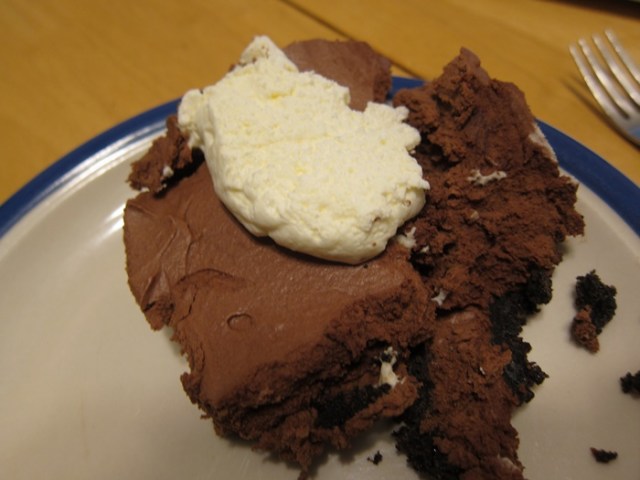 When ready to serve, beat up the remaining cup of heavy cream with the sugar to stiff peaks, then use to decorate/top. A tip I got from my mom that works well here is, if you’re not going to serve/eat all that whipped cream right then, once it’s beaten to stiff peaks, beat in a spoonfull of vanilla or white chocolate pudding powder – this will keep the whipped cream from separating (oozing liquid), so you can top the dessert and not have to worry about the whipped cream going weird before you’ve gotten through all the leftovers. Additionally, if you’re going to be bringing this dessert with you, you can scoop the whipped cream into a ziplock, get where you’re going, and cut a corner off the ziplock to use as a piping bag, and squeeze it onto the mousse when ready to serve. (I cut off an excessively large corner, so my decorating was a ridiculous joke.)