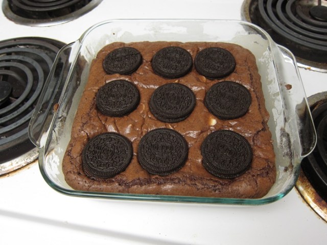 Spread batter in the prepared pan. Press 9 Oreos into the surface of the batter, spaced evenly.