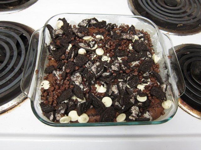 When the brownies are done baking, sprinkle the crushed Oreo/chocolate chip mixture over the top of the brownies, then put back in the oven for 2-3 minutes.