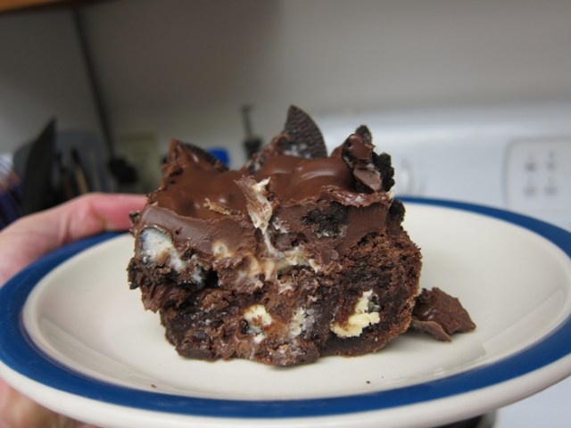 Dense brownies covered in Oreos, and then a layer of chocolate peanut butter, this is a real rich dessert! I cut mine into 9 pieces, but then ended up chopping those some, as this is an intense dessert to eat that big a piece of, but however much you do eat, you will probably love it!