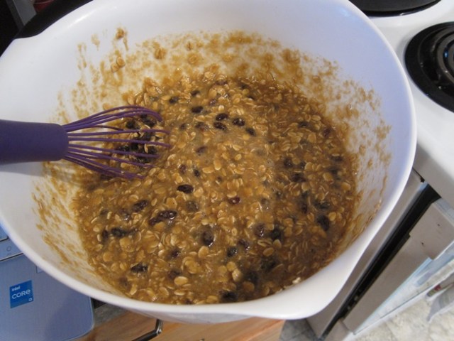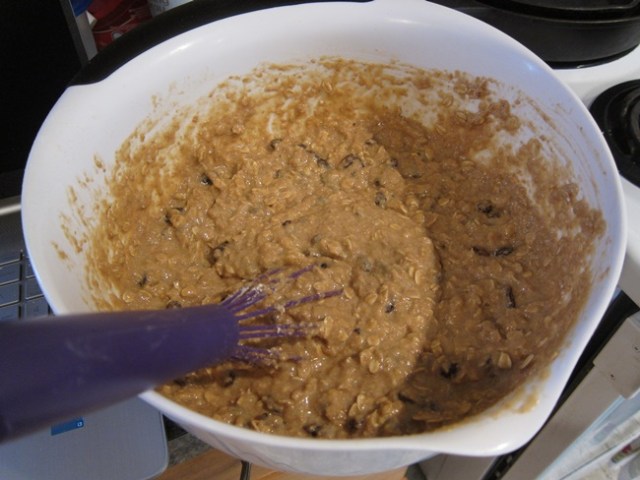 In a large bowl, whisk together the brown sugar, eggs, applesauce, and oats.