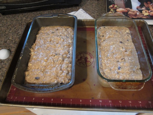 Transfer the mixture to the bread pan and bake for 1 hour. One of my bread pans is an 8×4, so I put the bread pans on a bigger pan in case there was too much batter and it overflowed, but that didn’t turn out to be an issue.