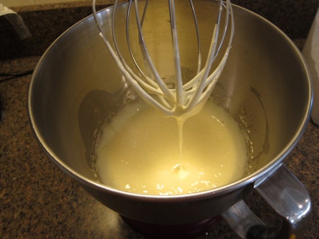 Beat together the eggs, sugar, and vanilla in a large bowl until the mixture forms a ribbon when the beater is lifted, at least 3-4 minutes – I beat for longer. Mix in the lemon zest.