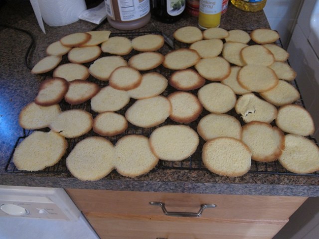 Flatten the mounds of batter to 2″ rounds using the back of a spoon that’s been dipped in water. (The water didn’t do much in my experience.)