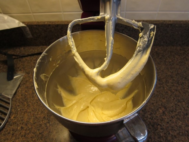 Add the beaten butter in batches to the egg mixture, alternating with the flour.