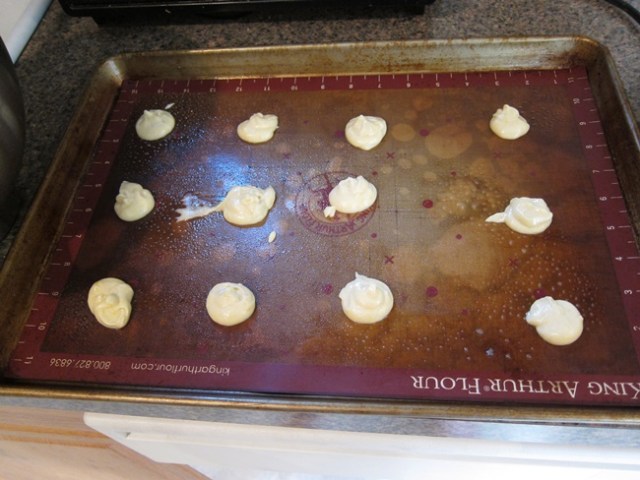 Flatten the mounds of batter to 2″ rounds using the back of a spoon that’s been dipped in water. (The water didn’t do much in my experience.)