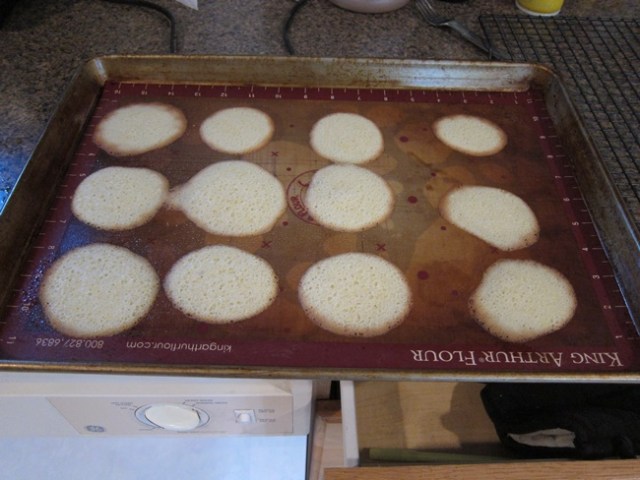 In another bowl, beat the butter until light and fluffy. Add the beaten butter in batches to the egg mixture, alternating with the flour. Once fully mixed, drop teaspoons of the batter 2 1/2 inches apart on the prepared baking sheets. Flatten the mounds of batter to 2″ rounds using the back of a spoon that’s been dipped in water. Bake for 5 minutes, or until the edges are browned.