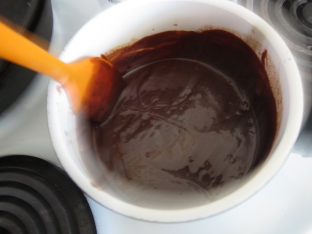 Heat the cream in a small saucepan until it just begins to simmer. Remove from the heat and add the chocolate. Let sit for one minute, then stir until smooth.