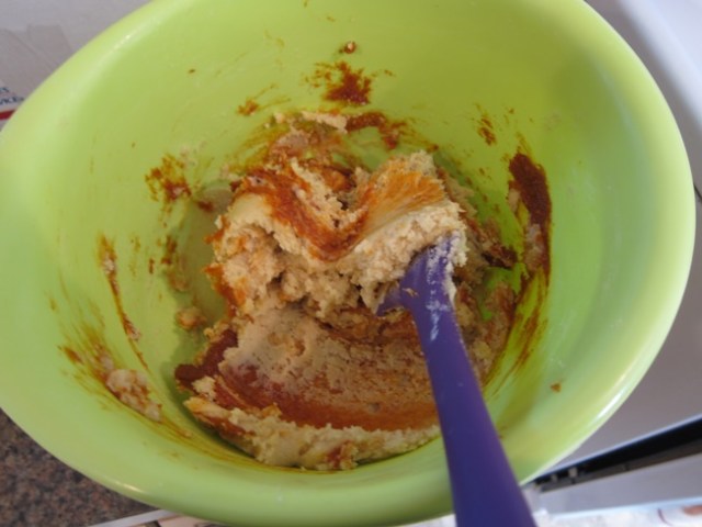 Gently swirl the gochujang mixture into the dough, using just a handful of swipes to create streaks through the dough, rather than stirring so much that it becomes evenly distributed.